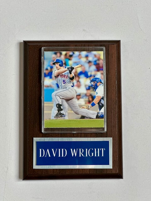 This David Wright New York Mets commemorative plaque features a crisp 4×6 action photo of Wright at bat, wearing his iconic number 5 uniform. With a clean nameplate and ready‑to‑display wooden mount, this affordable $10 collectible is a perfect addition for Mets fans and Wright collectors.