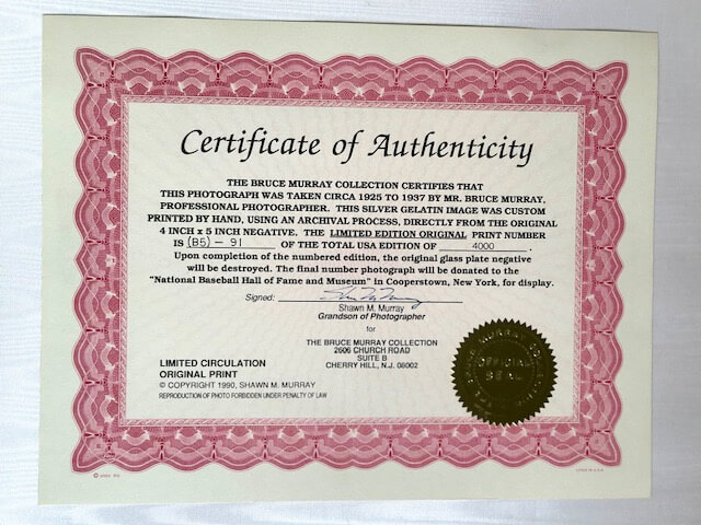 • Certificate of Authenticity signed by Shawn M. Murray (grandson of photographer)