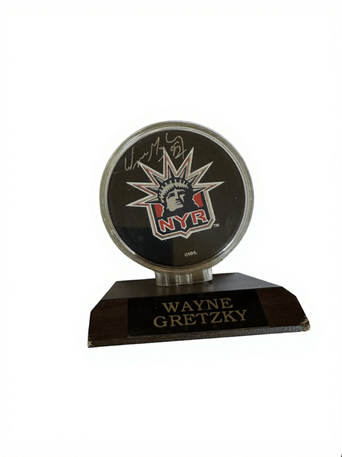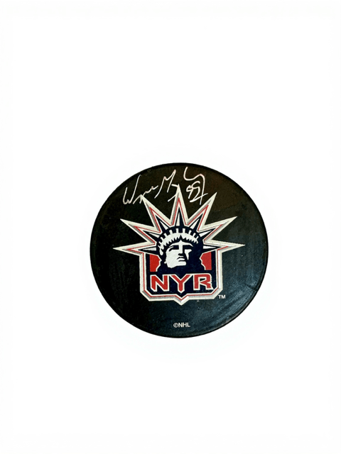 Wayne Gretzky’s arrival in New York in 1996 marked the final chapter of a legendary career, bringing milestone assists, unforgettable chemistry with Mark Messier, and a renewed electricity to Madison Square Garden. The Liberty‑era logo became synonymous with that period, capturing the style and identity of late‑’90s Rangers hockey. This puck preserves that moment in time with a signature from the greatest to ever play the game.