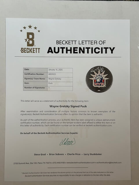 This display‑ready Gretzky autographed puck blends signature, symbolism, and presentation into one standout collectible. The Liberty logo brings unmistakable New York identity, while Gretzky’s clean autograph adds the presence of the NHL’s all‑time points leader. The wooden stand and engraved plaque elevate the piece to a museum‑grade display, and the Beckett certification provides the trusted verification collectors demand. Whether you’re building a Rangers wall, expanding a Gretzky collection, or adding a signature centerpiece to your sports room, this puck delivers impact from every angle.